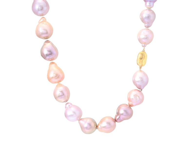 PÄRLCOLLIER, odlade sötvattenspärlor, rosa och lila toner, ovala till barocka ca 15,0 mm, lås i silver och gulmetall, längd ca 45 cm, vikt ca 130,0 g.