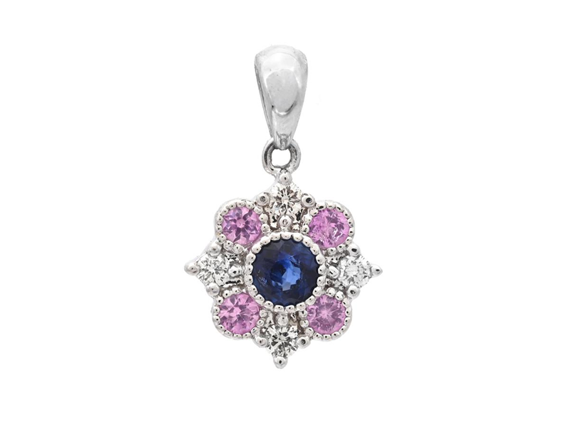 HÄNGE, 18K vitguld, blå safir 0,18 ct, 4 rosa safirer 0,14 ctv, 4 briljantslipade diamanter 0,07 ctv, ca W-Cr/SI-P, längd ink ögla 14,0 mm, vikt 1,0 g.