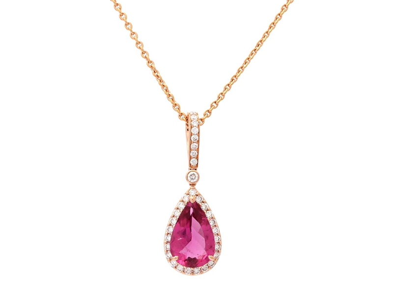 HÄNGE MED KEDJA, 18K roséguld/guld med droppslipad rubelit 2,10 ct, 34 briljantslipade diamanter 0,37 ctv, ca TW-W/VS-SI, längd 40 cm, vikt 5,5 g