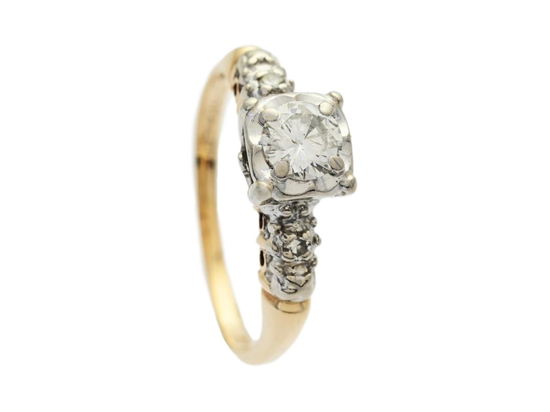 RING, 14K guld/vitguld, briljantslipad diamant ca 0,35 ct, ca W/P, 2 åttkantslipade diamanter ca 0,04 ctv, ca Ca/P, stl 17 mm, vikt 2,3 g, mittstenen har nagg på kuletten.