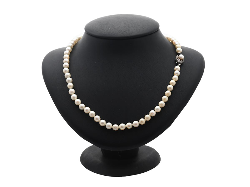PÄRLCOLLIER, odlade pärlor, 5-6 mm, lås i silver med odlad pärla, längd 47 cm, vikt 24,2 g, slitage.