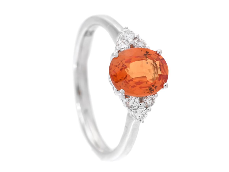 RING, 18K vitguld, oval fasettslipad orange safir 1,57 ct, 6 briljantslipade diamanter 0,15 ctv, ca TW/SI, storlek 17 mm, vikt 3,0 g.