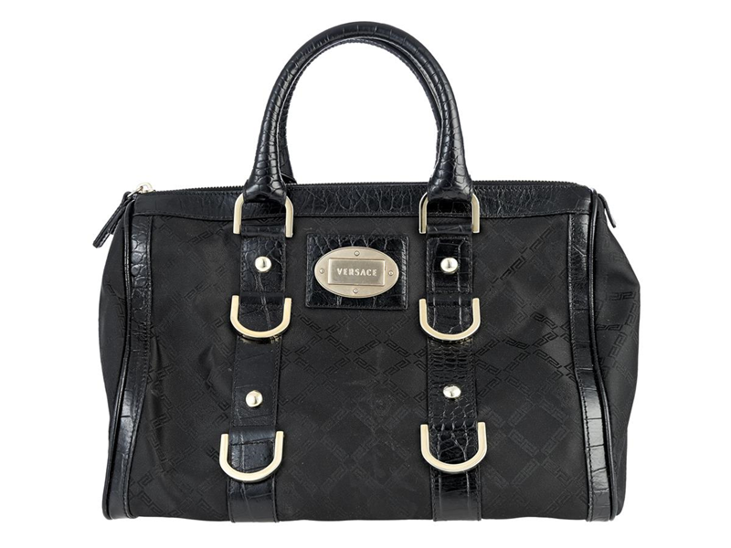 VÄSKA, VERSACE, Boston Bag, svart skinn, tyg, guldfärgade beslag, 32x21x17 cm, dustbag, bruksslitage.