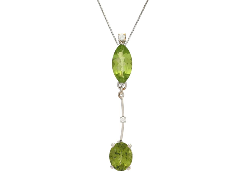 HÄNGE MED KEDJA, 18K vitguld, 2 peridoter ca 5,20 ctv, 2 briljantslipade diamanter ca 0,06 ctv, ca TW/VS, höjd 50 mm, kedja 44 cm, vikt 4,8 g, peridoter med nagg.