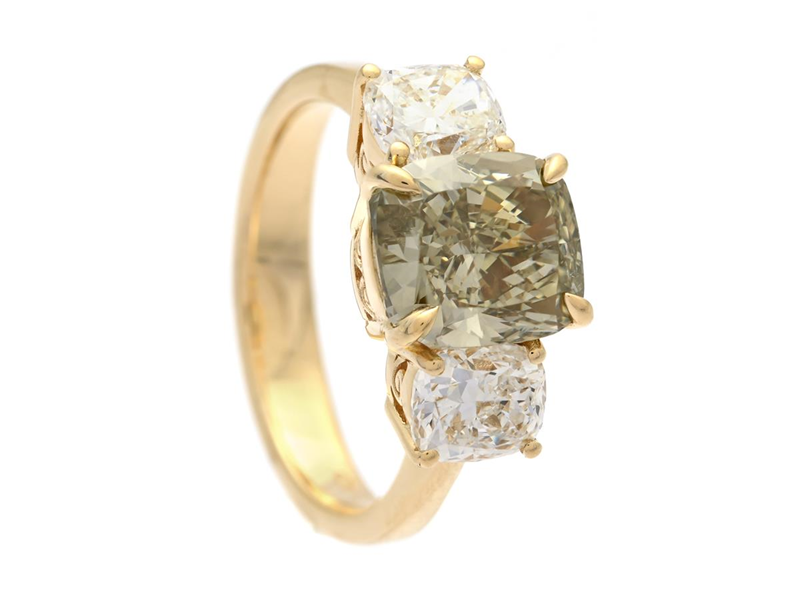RING, 18K guld, kuddslipad diamant 3,07 ct, Fancy Dark Brown-Greenish Yellow/SI2, GIA Colored Diamond Report, 2 kuddslipade diamanter 1,40 ctv, TW(G)/VS1, GIA Diamond Dossier 2477315508 och 7468455433, stl 17,25 mm, vikt 6,0 g.