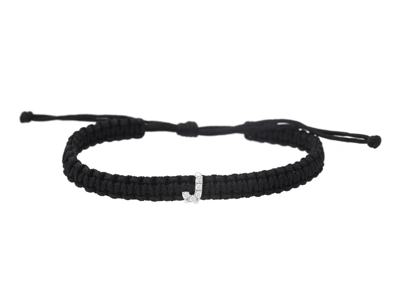 BOKSTAVSARMBAND, bokstav J, 18K vitguld, 5 briljantslipade diamanter 0,04 ctv, ca W/VS-SI, svart nylonsnöre, justerbar längd, vikt 0,9 g.