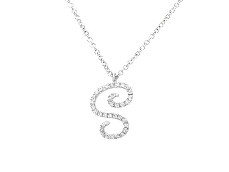 BOKSTAVSCOLLIER, bokstav S, 18K vitguld, 34 briljantslipade diamanter 0,11 ctv, ca W/VS-SI, höjd 13,0 mm, bredd 10,5 mm, längd 40/42 cm, vikt 2,8 g.