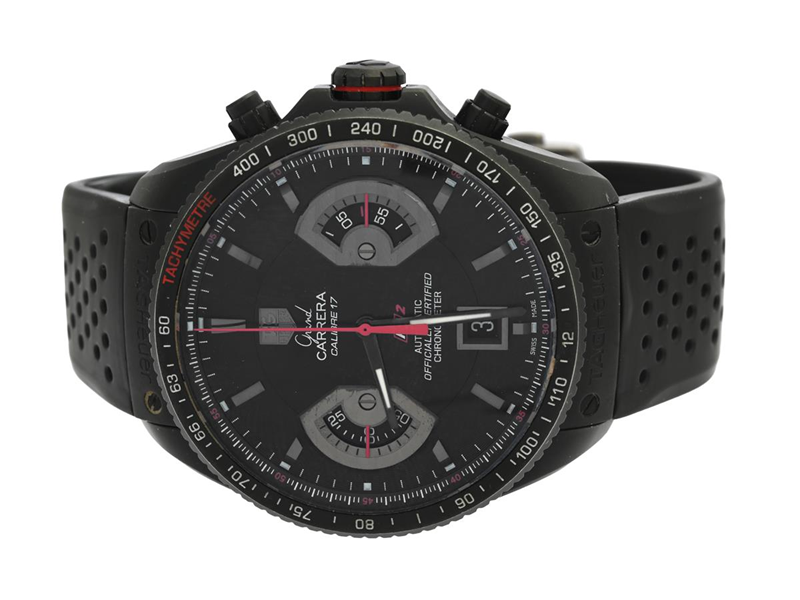 TAG HEUER, Grand Carrera, RS2, Chronometer, "Tachymetre", Cal 17 (ETA 2894-2), Serie nr. 1692249, Ref nr. CAV518B.FC6237, kronograf, herrur, 43 mm, svart titan (titanium carbide), automatisk, safirglas, datum, glasbaksida, läderband, gummiband, viklås (titan), Ref nr. FC5039-0, cert, februari 2009, box, ytterkartong.