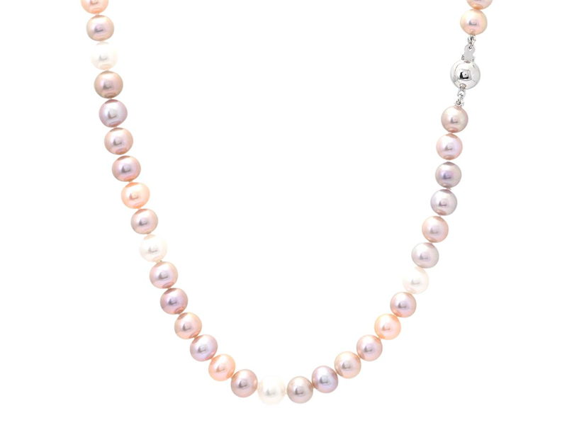 PÄRLCOLLIER, odlade sötvattenspärlor rosa , peach och lila, 7,0-7,5 mm, lås i sterlingsilver, längd 45 cm.