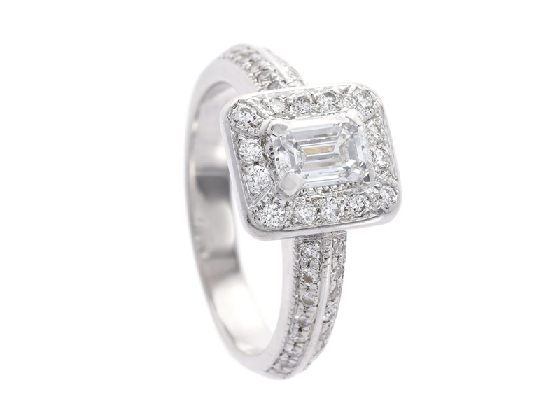 RING, 18K vitguld, smaragdslipad diamant ca 0,70 ct, ca TW(F)/VVS, 46 briljantslipade diamanter ca 0,50 ctv, stl 17,5 mm, vikt 7,0 g, en mindre diamant är skadad, i övrigt några diamanter med mindre skador och nagg.