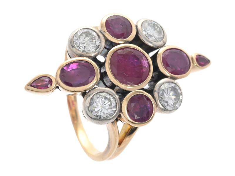 RING, 18K guld/silver, rubiner ca 5,00 ctv, 4 briljantslipade diamanter ca 1,35 ctv, ca TW-TCr/P, stl 18,5 mm, vikt 12,5 g, rubiner med ninneslutningar som når ytan, nagg samt slitna fasettkanter, enstaka diamanter med nagg, en diamant med slöja.