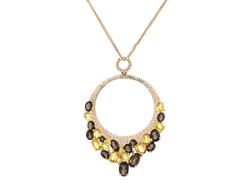 HÄNGE MED KEDJA, 18K guld, rökkvarts, safirer, diamanter ca 0,80 ctv, höjd 50 mm, kedja 44 cm, vikt 7,5 g, flera diamanter med nagg.