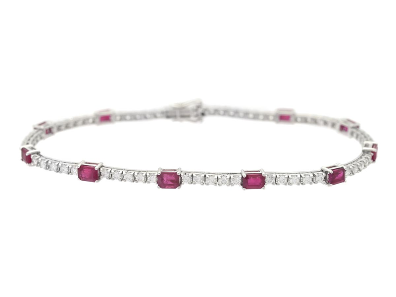 TENNISARMBAND, 18K vitguld, 61 briljantslipade diamanter ca 1,10 ctv, ca TW-W/SI-P, 10 rubiner ca 2,83 ctv, längd 18 cm, vikt 7,1 g.