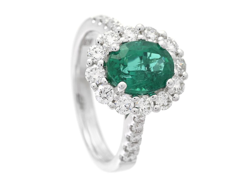 CARMOSÉRING, 18K vitguld, oval fasettslipad smaragd 1,74 ct, 22 briljantslipade diamanter 0,86 ctv, ca TW/VS-SI, GRS Gemstone Report GRS2025-108141, storlek 17 mm, vikt 5,3 g.