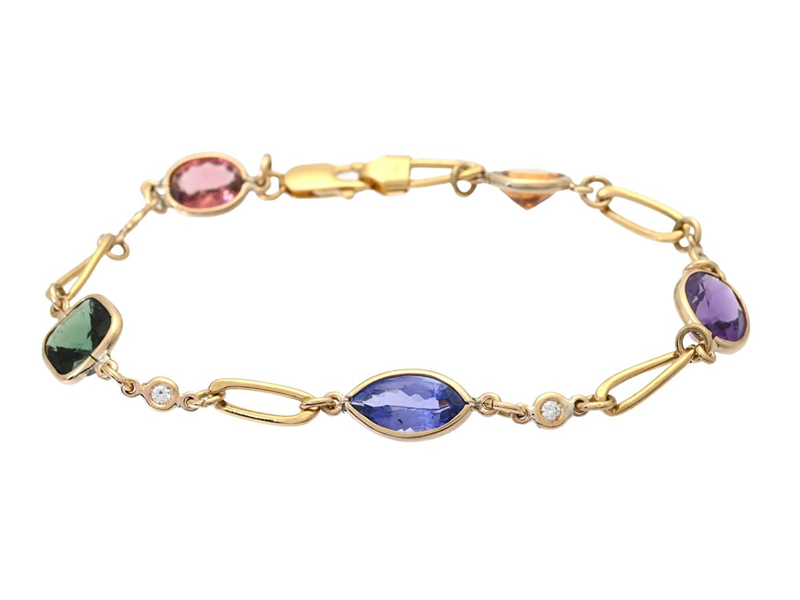 ARMBAND, 18K guld, citrin, ametist, iolit, turmaliner, 4 briljantslipade diamanter ca 0,12 ctv, ca W/VS, längd 20 cm, vikt 8,3 g, några färgstenar med nagg och repor.