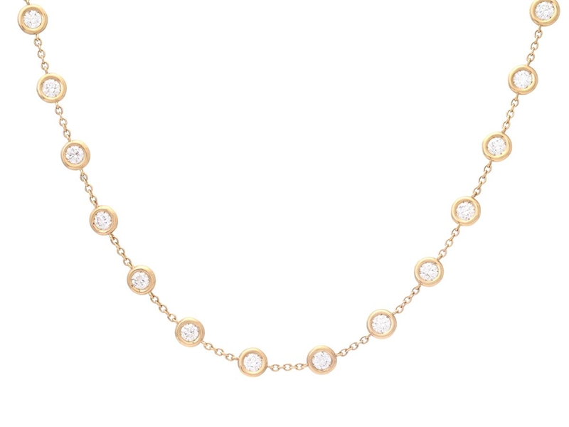 COLLIER, 18K guld, 57 briljantslipade diamanter ca 9,07 ctv, ca R-TW/VS-SI, längd 80 cm, vikt 22,5 g, enstaka diamanter med nagg på kuletten.