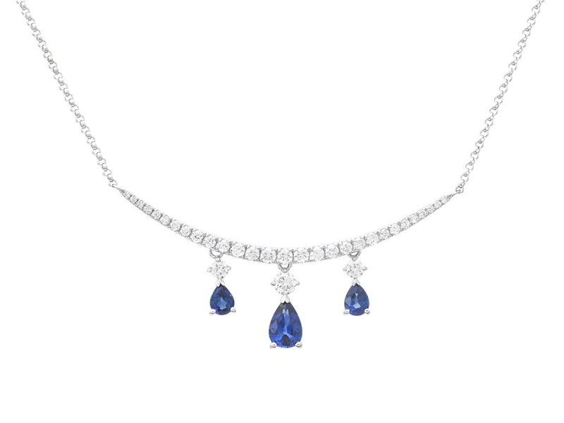 COLLIER, 18K vitguld, 3 droppformade fasettslipade blå safirer 0,80 ctv, 32 briljantslipade diamanter 0,49 ctv, ca TW/VS, motivets bredd ca 40,0 mm, längd 40 cm, vikt 3,6 g.