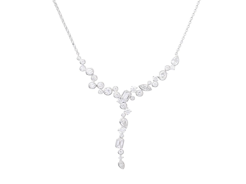 COLLIER, 18K vitguld, 2 smaragdslipade diamanter 0,70 ctv, oval briljantslipad diamant 0,25 ct, 2 droppformade briljantslipade diamanter 0,40 ctv, 2 navettslipade diamanter 0,28 ctv, 27 briljantslipade diamanter 1,85 ctv, ca TW/VS, längd 40 cm, vikt 8,6 g.