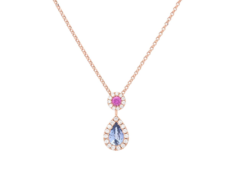 COLLIER, 18K roséguld, droppformad fasettslipad blå safir 0,42 ct, rund fasettslipad rosa safir 0,09 ct, 26 briljantslipade diamanter 0,14 ctv, ca TW-W/VS-SI, höjd 15,0 mm, längd 40/42/45 cm, vikt 2,7 g.