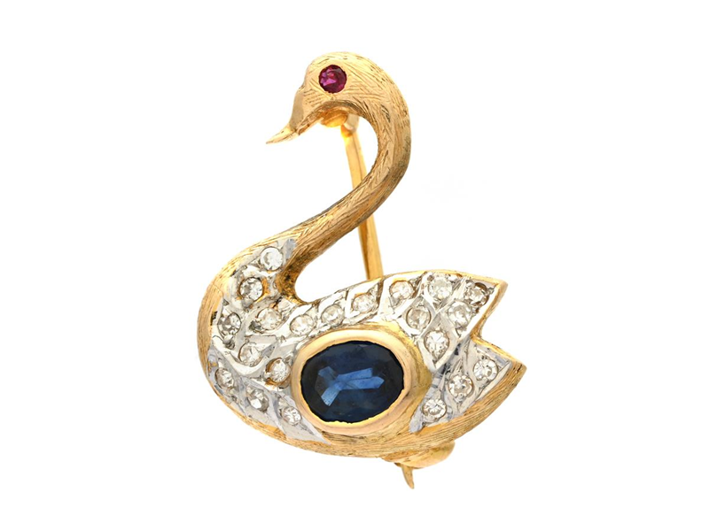 BROSCH, svan, 14K guld, safir, rubin, åttkantslipade diamanter, höjd 19 mm, vikt 2,4 g.