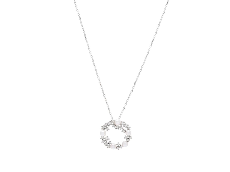 PÄRLHÄNGE MED KEDJA, 18K vitguld, 5 odlade pärlor, 24 briljantslipade diamanter 0,36 ctv, ca TW/VS, höjd 17,0 mm, kedja 42/45 cm, vikt 3,5 g.