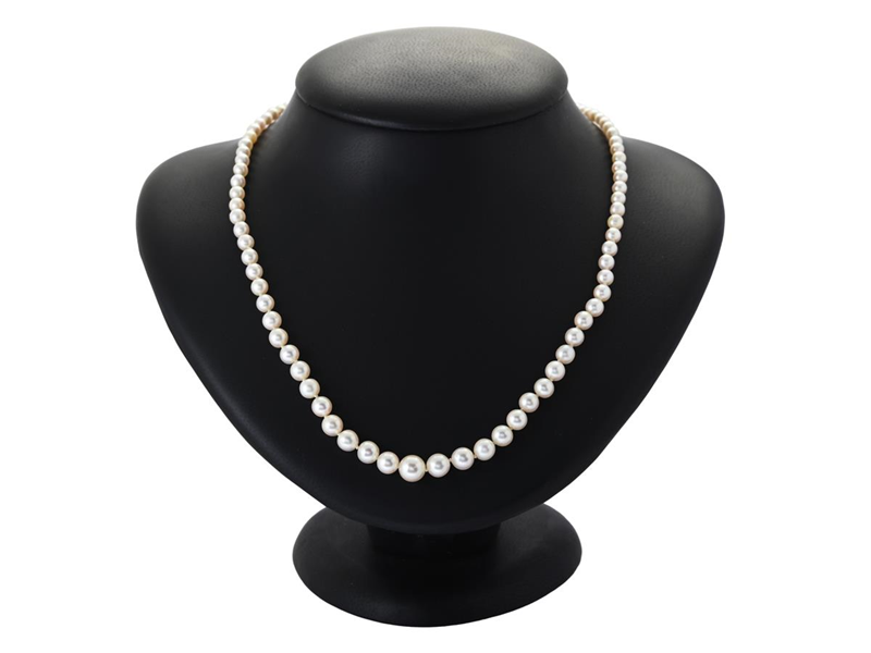 PÄRLCOLLIER, odlade pärlor ca 3-7 mm, 18K vitguld lås, åttkantslipade och rosenslipade diamanter, längd ca 49 cm, vikt 14,6 g.