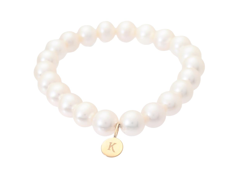 PÄRLARMBAND, odlade sötvattenspärlor ca 8,0 - 9,0 mm, bricka i 18K guld med bokstaven K, trädd på elastisk tråd, längd ca 18 cm.