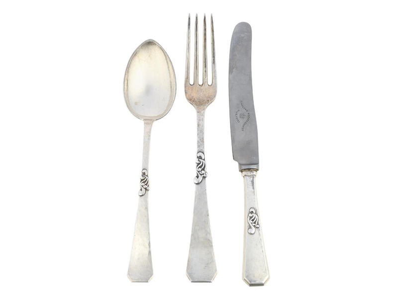 CHRISTIAN F HEISE, Johannes Siggaard, Fritz Heimbürger, matsilver, 12 bordsskedar, 12 matgafflar 12 matknivar, Danmark, 1930-tal, vikt 1354,7 g.