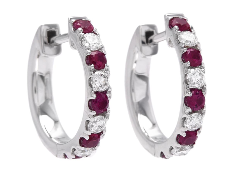 ÖRRINGAR, 18K vitguld, 10 runda fasettslipade rubiner 0,29 ctv, 8 briljantslipade diamanter 0,21 ctv, ca TW/VS, stift, höjd 13,0 mm, bredd 2,0 mm, vikt 2,4 g.