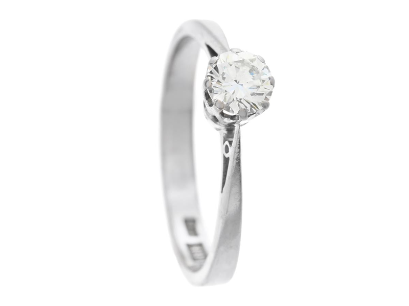 ENSTENSRING, 18K vitguld, briljantsliupad diamant 0,38 ct enligt gravyr, ca W/VS, stl 17 mm, vikt 2,9 g. slitna klor.