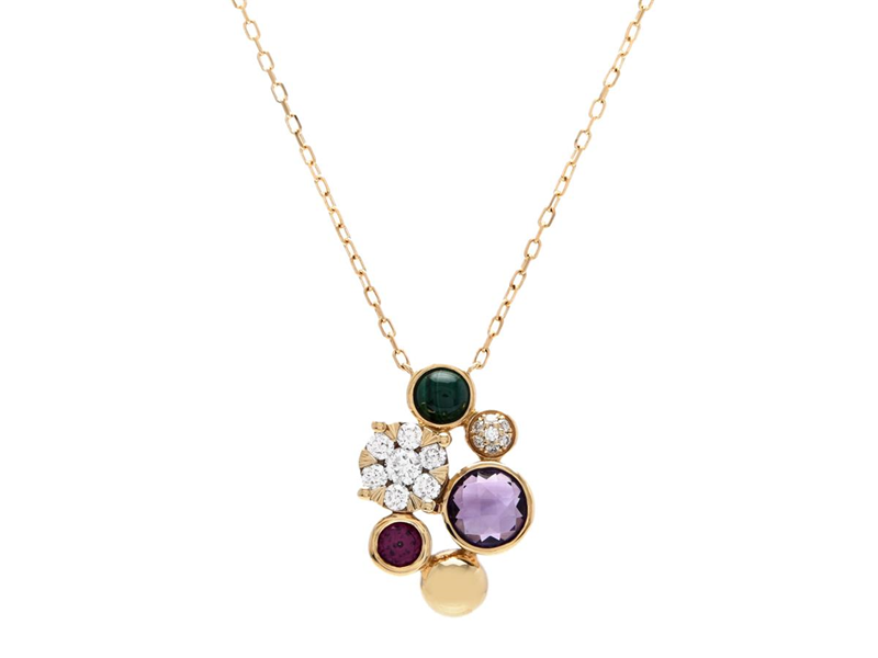 COLLIER, 18K guld, malakit, ametist, granat, 14 briljantslipade diamanter 0,32 ctv, ca TW-W/VS-SI, höjd 19,0 mm, längd 40/42,5/45 cm, vikt 4,4 g.