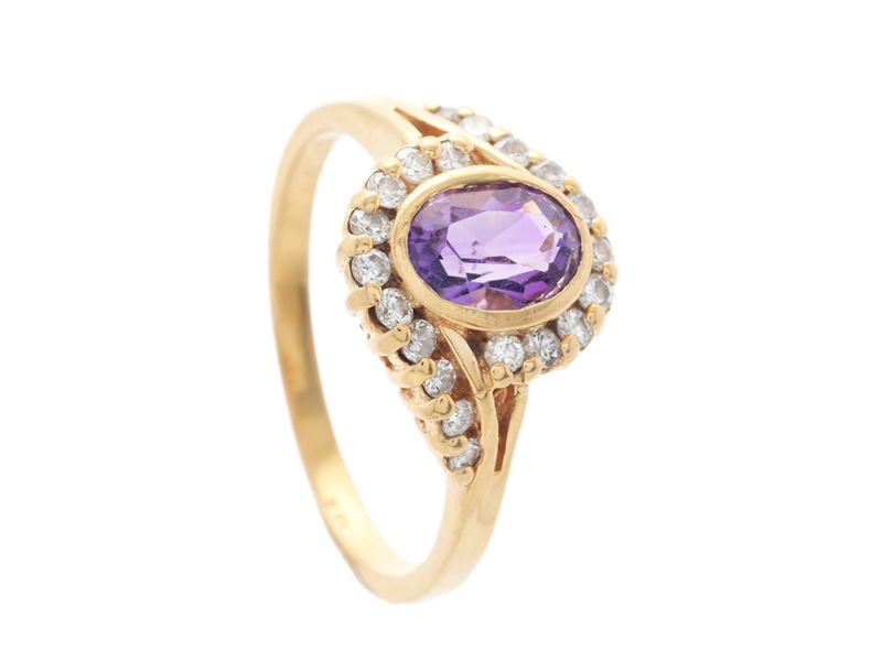 CARMOSÉRING, 18K guld, oval fasettslipad ametist, 20 briljantslipade diamanter 0,31 ctv enligt gravyr, ca W/SI, storlek 17,5 mm, vikt 3,6 g, någon diamant med skada.