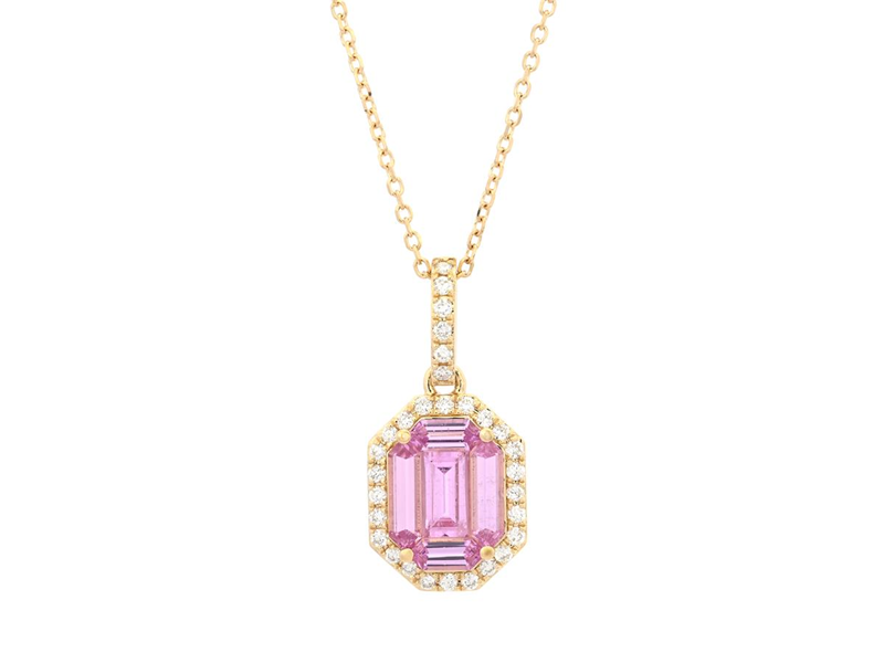 HÄNGE MED KEDJA, 18K guld, rosa safirer 0,65 ctv, 30 briljantslipade diamanter 0,12 ctv, ca TW-W/VS-SI, längd 18,0 mm ink ögla, kedja 40/42/44 cm, vikt 2,3 g.