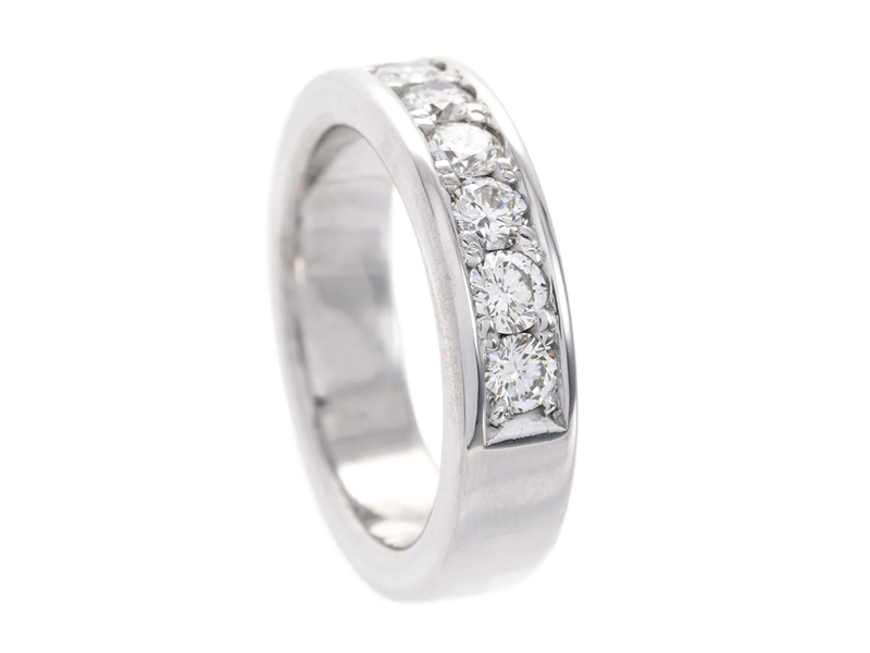 SCHALINS, alliansring, 18K vitguld, 7 briljantslipade diamanter ca 0,70 ctv enligt gravyr, ca TW/SI, stl 15,75 mm, vikt 8,7 g, en diamant skadad, några diamanter med små nagg på kuletten.