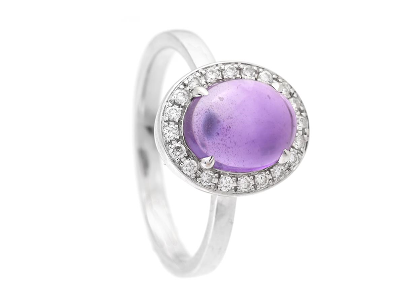 RING, 18K vitguld, cabpchonslipad ametist, 20 briljantslipade diamanter ca 0,20 ctv, ca W/SI, stl 17 mm, vikt 3,9 g.