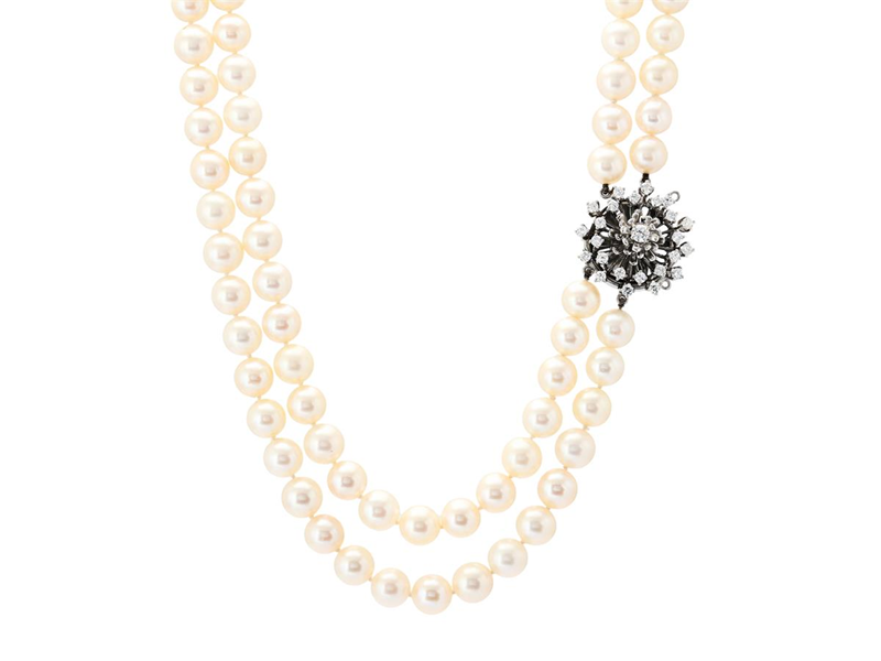 PÄRLCOLLIER, 2-radigt, odlade pärlor ca 9,0-9,2 mm, lås i 18K vitguld, 25 briljantslipade diamanter ca 1,57 ctv, ca TW-W/VS, Hellströms, Stockholm 1993, längd 46 cm, vikt 118,0 g, skört silke, lås för 3 rader.