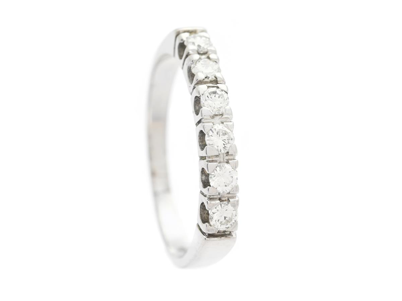 ALLIANSRING, 18K vitguld, 6 briljantslipade diamanter ca 0,24 ctv, ca W-TCr/VS-SI, stl 17+ mm, vikt 2,5 g, några diamanter med nagg.