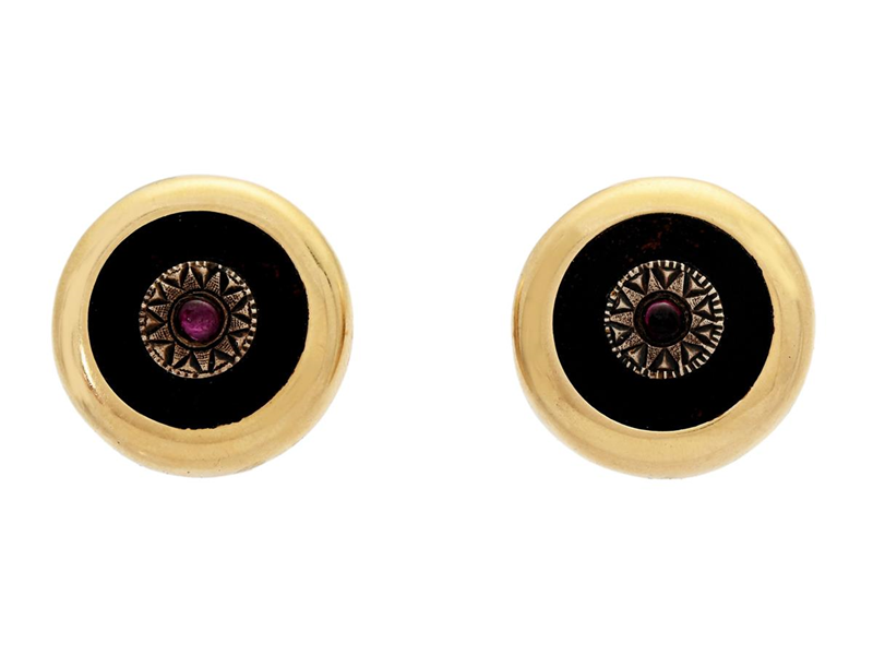 ÖRHÄNGEN, 14K guld, blodsten, 2 cabochonslipade rubiner, höjd ca 18,0 mm, vikt 6,7 g, stift, inga snurrebussar, nagg på en av rubinerna.