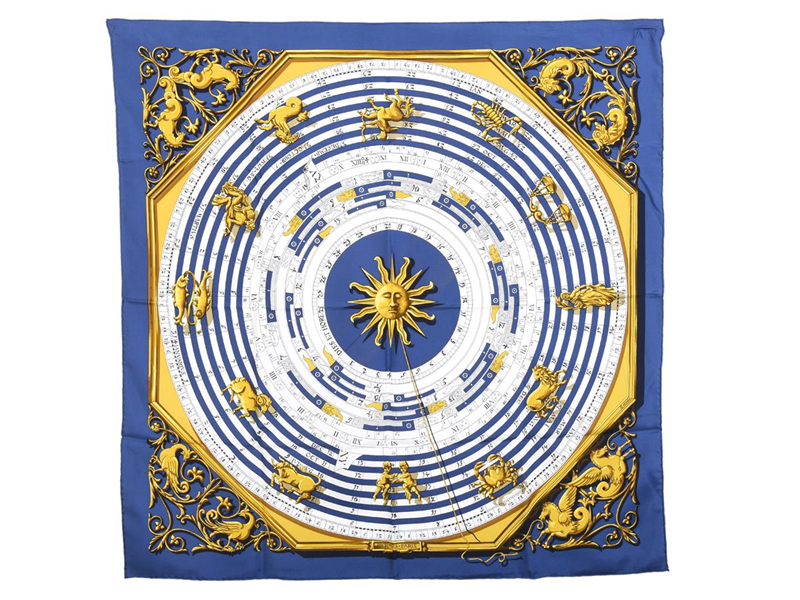 SCARF, HERMÈS, Astrologie Dies et Hore, Françoise Façonnet, 100% siden, 90x90 cm, blå, vit, gul.