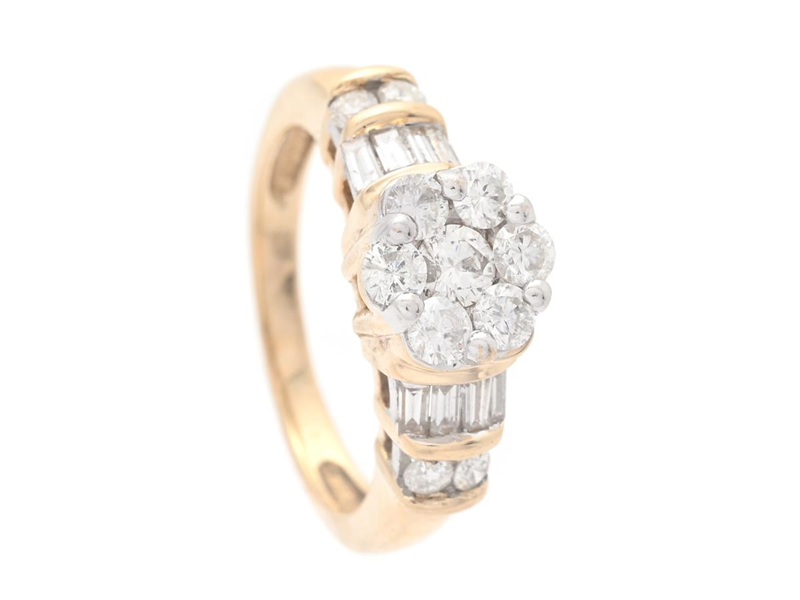 RING, 14K guld, briljantslipade diamanter ca 0,52 ctv, ca TW-Cr/SI-P, trapettsslipade diamanter, stl 15,75 mm, vikt 4,2 g, en briljantslipad diamant är skadad, svaga fattningar.