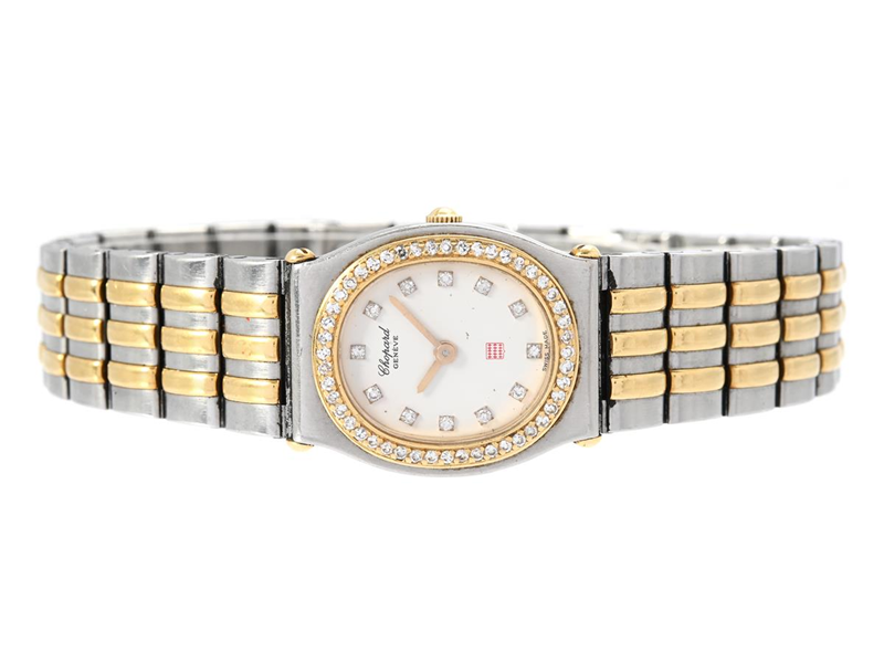CHOPARD, Genève, Monte-Carlo, Boett nr. MC 7523 / 8034, damur, 21 x 25 mm, stål/guld, quartz, safirglas, diamanter på urtavlan (12 st. 8/8), skadad urtavla, defekt (går ej, akut servicebehov), briljantkrans (48 st.), integrerad originallänk, viklås, ca 1990, box, ytterkartong.