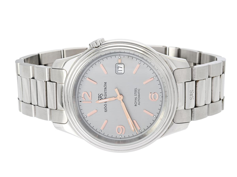 SJÖÖ SANDSTRÖM, Royal Steel Classic 41, Cal SS G7 (SW 300-1), Serie nr. 1661, Ref nr. SS-1841-1, herrur, 41 mm, stål, automatisk, safirglas (repor), datum, originallänk, viklås, cert, juli 2024, träbox, ytterkartong.