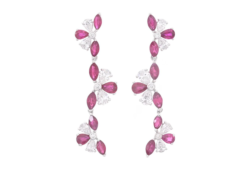 ÖRHÄNGEN, 18K vitguld, navett- och droppformade fasettslipade rubiner ca 1,73 ctv, runda och droppformade briljantslipade diamanter ca 0,76 ctv, ca TW-W/VS-SI, stift, längd 31,0 mm, vikt 3,2 g.