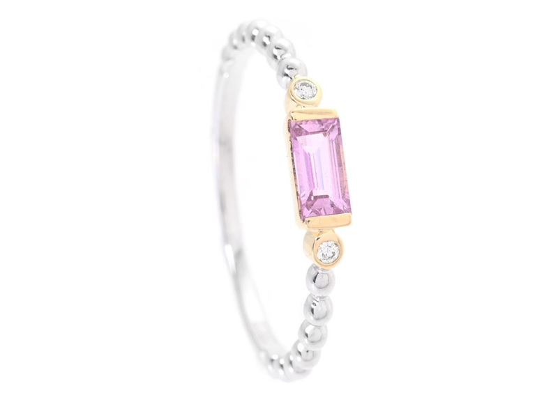 RING, 18K guld/vitguld, baguetteslipad rosa safir ca 0,30 ct, briljantslipade diamanter ca 0,01 ctv, ca W/SI, storlek 16,75 mm, vikt 1,4 g.