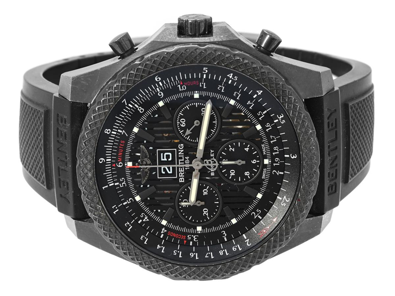 BREITLING, for Bentley 6,75 Speed, "Midnight Carbon", Chronometre, Cal 44 (2892A2), Verk nr. 2570449, Serie nr. 2570449, Ref nr. M4436413/BD27, Boett nr. 5013 B3, kronograf, herrur, 48,7 mm, svart stål, automatisk, safirglas, stort datum, gummiband, viklås (svart stål), cert, oktober 2014, box, ytterkartong. Limiterad och numrerad (Nr. 281/1000).