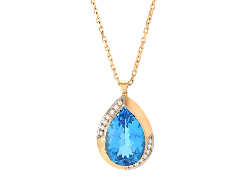HÄNGE/KEDJA, 18K guld/vitguld, droppslipad topas ca 65,00 ctv, 14 briljantslipade diamanter ca 1,00 ctv, ca TW/VS, Stockholm 1980/90-tal, höjd 50 mm, längd 54 cm, vikt 44,5 g.