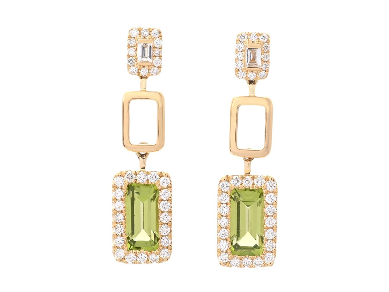 ÖRHÄNGEN, 18K guld, smaragdslipade peridoter ca 1,31 ctv, baguette- och briljantslipade diamanter ca 0,32 ctv, ca TW-TCr/VS-SI, stift, längd 24,0 mm, vikt 4,3 g.
