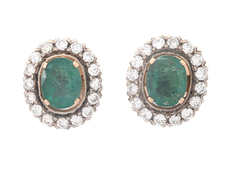 ÖRHÄNGEN, 14K guld, 2 ovalslipade smaragder ca 1,50 ctv, 32 briljantslipade diamanter ca 0,65 ctv, ca W-TCr/SI-P, löstagbara kransar, stift, vikt 5,6 g, smaragder med nagg, ett fåtal diamanter med nagg.