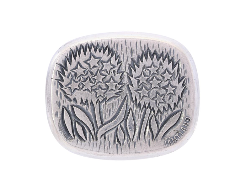 C.F. CARLMAN, brosch, silver, brunkulla, Jämtlands landskapsblomma, Stockholm 1956, mått 39x33 mm, vikt 12,8 g.