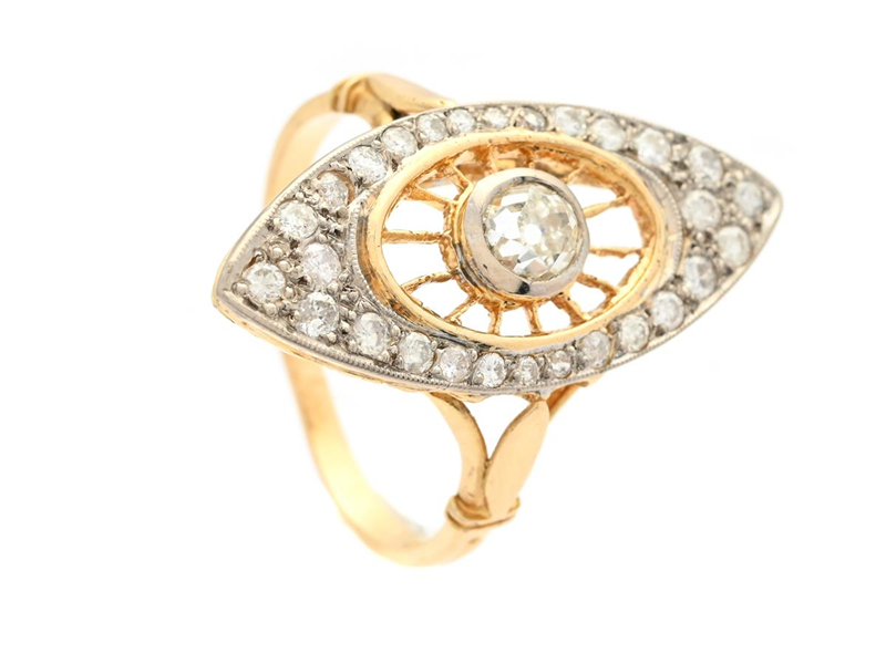 RING, 18K guld, antikslipad diamant ca 0,45 ct, ca Ca/VS, 28 briljantslipade diamanter ca 0,40 ctv, ca W-Cr/P, stl 16,25 mm, vikt 4,5 g, en diamant sitter snett i sin fattning, skev ringskena.